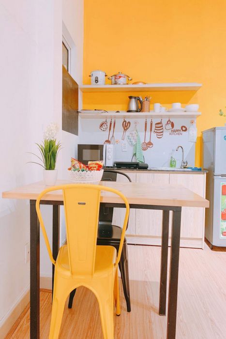 Phòng bếp tại đây được trang trí vô cùng dễ thương, tạo nên không khí vui vẻ khi bạn thực hiện các công việc nấu nướng. Màu sắc vàng ấm cúng của căn bếp chắc chắn sẽ làm bạn cảm thấy thoải mái.