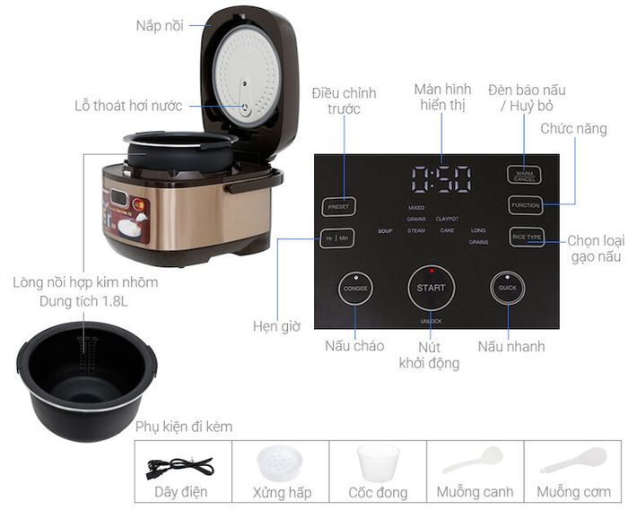 Bảng điều khiển cảm ứng tiếng Anh kèm màn hình LED dễ dàng thao tác. Thực đơn nấu tự động giúp người dùng tiết kiệm thời gian. Nồi có chế độ hẹn giờ nấu 24h và giữ ấm lên đến 12h.