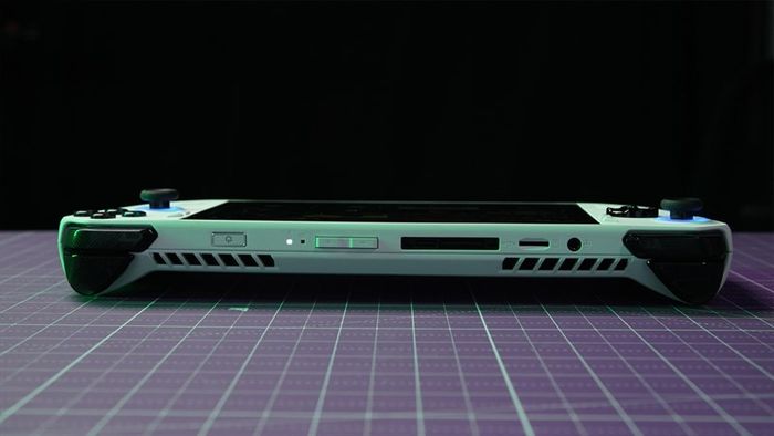 Phần trên của ASUS ROG Ally có các phím chức năng như LB, LT, RB, RT ở hai góc, cùng với cổng âm thanh 3.5 mm, khe thẻ nhớ micro SD, cổng sạc, kết nối với eGPU XG Mobile, phím tăng/giảm âm lượng, nút nguồn có cảm biến vân tay và hai khe tản nhiệt.