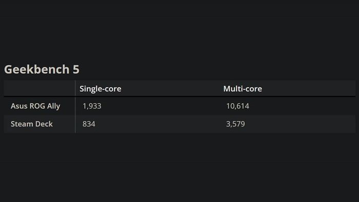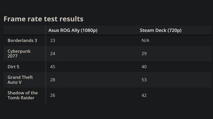 Để hiểu rõ về hiệu suất chiến game, Tom's Guide sử dụng Geekbench 5 và thử nghiệm các tựa game AAA như Cyberpunk 2077, GTA V, Shadow of the Tomb Raider. So sánh với Steam Deck ở độ phân giải mặc định (ASUS ROG Ally: 1080p, Steam Deck: 720p). Kết quả chi tiết có thể tham khảo bảng dưới đây.