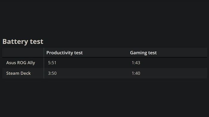 Bên cạnh đó, ASUS ROG Ally được trang bị pin 40 Whs, hỗ trợ sạc nhanh 65 W giúp sạc pin nhanh chóng. Thử nghiệm thời lượng pin cho thấy khoảng 5 giờ 51 phút trong tình trạng sử dụng thông thường và giảm xuống 1 giờ 43 phút khi chơi game hoặc sử dụng phần mềm đòi hỏi nhiều tài nguyên.