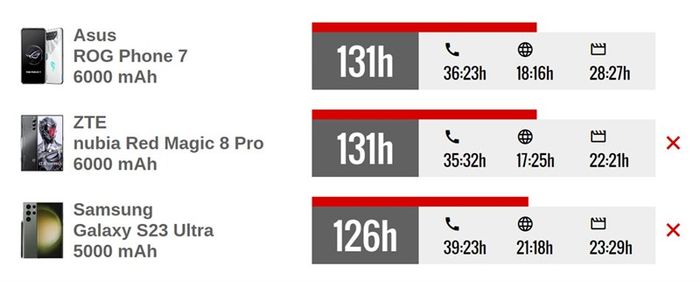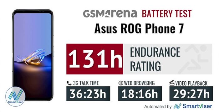 ASUS ROG Phone 7 giữ chế độ chờ đến 131 giờ. Nguồn: GSMArena.Không chỉ vậy, các thử nghiệm cụ thể cho kết quả như sau: