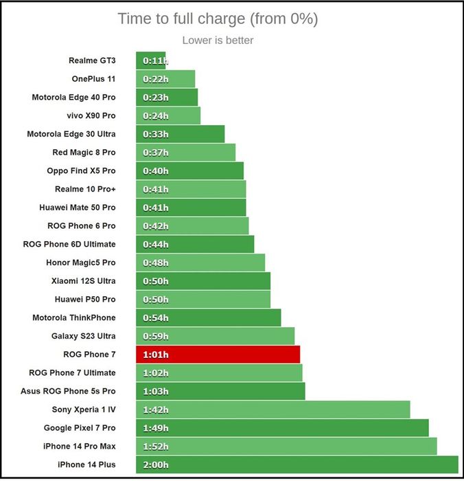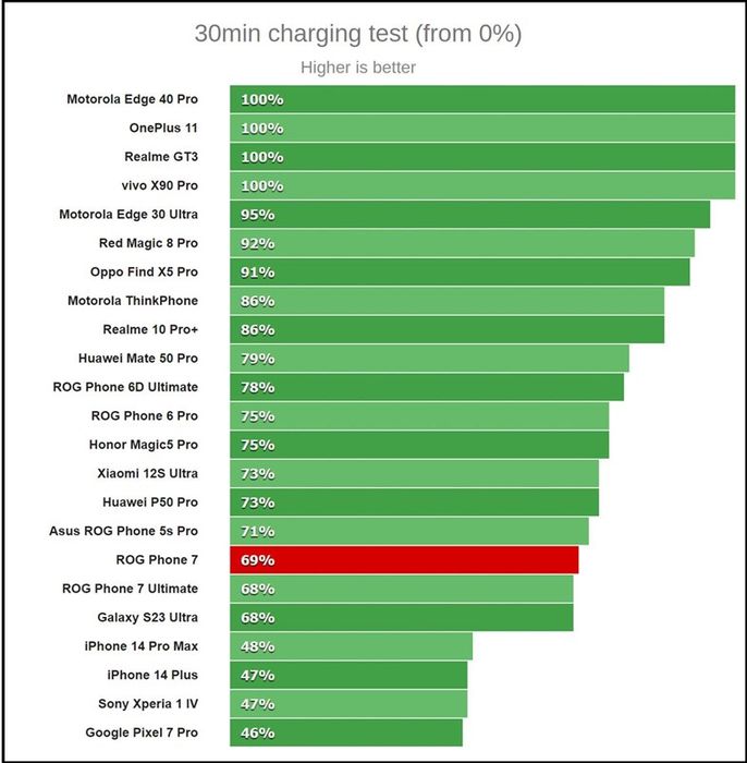 ASUS ROG Phone 7 vượt trội so với các đối thủ. Nguồn: GSMArena.Không chỉ có thời lượng pin ấn tượng, ROG Phone 7 còn hỗ trợ sạc nhanh 65W. Cùng với củ sạc mạnh mẽ đi kèm, ROG Phone 7 sẵn sàng đáp ứng nhanh chóng mọi nhu cầu sạc pin. ASUS tiếp tục sử dụng chuẩn sạc USB Power Delivery và củ sạc này thậm chí có khả năng cung cấp nguồn cho một số laptop tương thích.