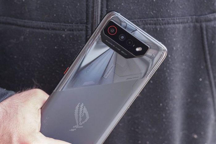 Mặt lưng của ASUS ROG Phone 7 được chú ý với thiết kế độc đáo. Nguồn: GSMArena.Cụm camera sau với 3 ống kính và đèn flash nằm trong khung viền đen là điểm đặc biệt trên mặt lưng của ASUS ROG Phone 7.