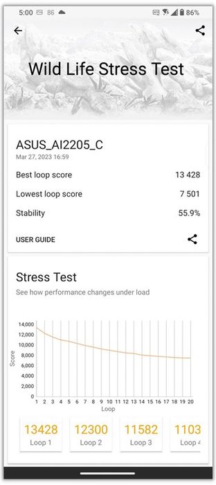 Bài test Wild Life Stress Test trên ứng dụng 3DMark của ASUS ROG Phone 7. Nguồn: GSMArena.Khoảng cách lớn giữa hai kết quả là 5.927 điểm và độ ổn định chỉ đạt 55.9%. Mặc dù kết quả không xuất sắc nhưng ROG Phone 7 thể hiện tính ổn định, giảm thiểu rủi ro giật lag khi chơi game lâu dài.