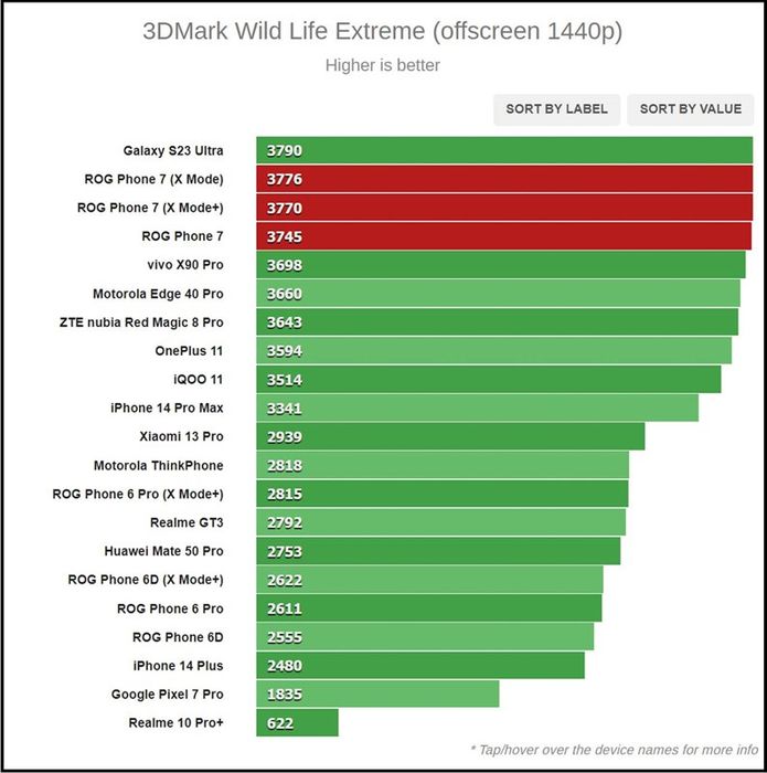 Kết quả bài test AnTuTu của ASUS ROG Phone 7. Nguồn: GSMArena.Bài test 3DMark tiếp theo, ASUS ROG Phone 7 với Snapdragon 8 Gen 2 đạt 3.745 điểm (3.776 điểm ở Chế độ X và 3.770 điểm ở Chế độ X+) trong bài test 3DMark Wild Life Extreme. Điểm số này đặt ROG Phone 7 ở vị trí đầu tiên trong số những thiết bị được trang bị Snapdragon 8 Gen 2.