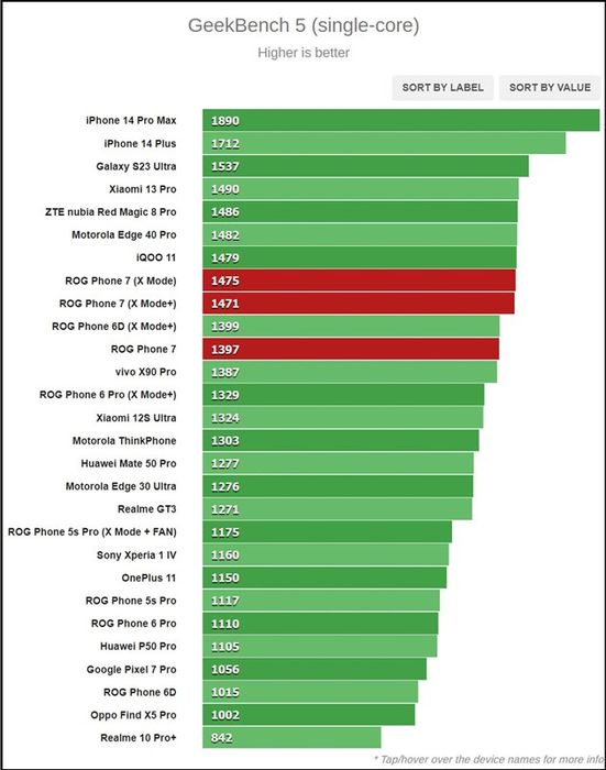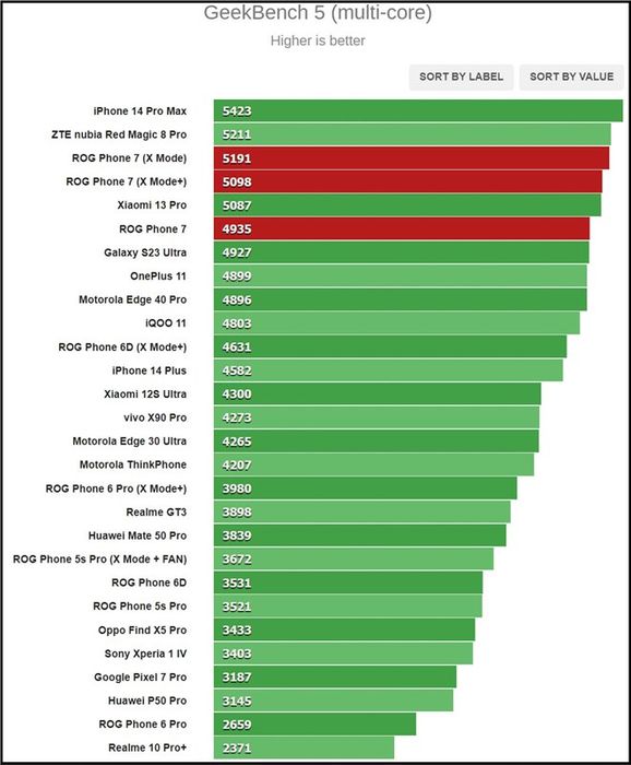 Chúng ta cùng nhìn vào kết quả chấm điểm hiệu năng của ASUS ROG Phone 7! Nguồn: GSMArena.Trong bài kiểm tra GeekBench, ASUS ROG Phone 7 đạt kết quả đa nhân là 4.935 điểm (5.191 điểm ở Chế độ X và 5.098 điểm ở Chế độ X+) và kết quả đơn nhân là 1.397 điểm (1.475 điểm cho Chế độ X và 1.471 điểm cho Chế độ X+). Kết quả ở bài test đa nhân khá ấn tượng hơn nhiều so với đối thủ, nhưng ở bài test đơn nhân, ASUS ROG Phone 7 không thể khiến người ta quá ấn tượng.