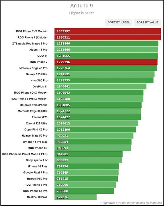Kết quả bài test đa nhân trên GeekBench của ASUS ROG Phone 7. Nguồn: GSMArena.Chuyển sang bài test AnTuTu, nơi ROG Phone 7 chứng tỏ sức mạnh với 1.279.196 điểm (1.333.597 điểm ở Chế độ X và 1.330.311 điểm ở Chế độ X+). Đây là kết quả ấn tượng so với các đối thủ, đồng thời là thành quả của RAM LPDDR5X 16 GB và bộ lưu trữ UFS 4.0.