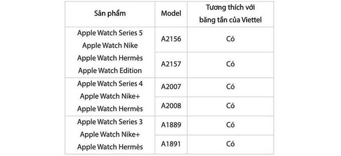 Dưới đây là danh sách một số mô hình Apple Watch tương thích với băng tần của Viettel
