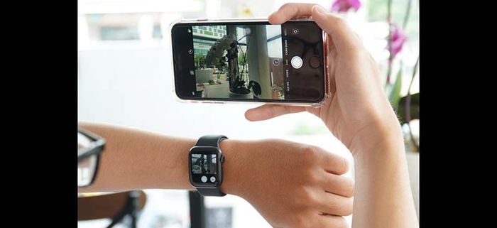 Ví dụ như camera, khi kích hoạt camera trên Apple Watch S5 LTE, màn hình hiển thị ngay khung cảnh từ camera của iPhone. Việc di chuyển cổ tay không ảnh hưởng đến khung hình vì camera không tích hợp trực tiếp trên đồng hồ. Để thay đổi góc chụp, bạn cần di chuyển chiếc iPhone.