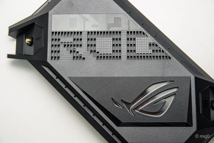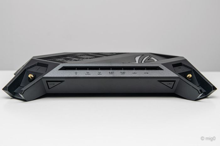 Phía trên của sản phẩm thể hiện logo mắt ROG, bên dưới là đèn LED RGB có thể điều chỉnh được, cũng như logo ROG được thiết kế thành các khe thoát nhiệt. Thiết kế tổng thể của router Rapture GT-AX6000 sử dụng các đường vát chéo cạnh tạo nên vẻ gồ ghề, phù hợp cho đối tượng game thủ và người dùng khắp nơi.