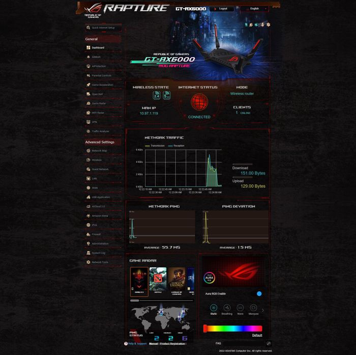 Giao diện điều khiển của GT-AX6000 được chia thành 2 phần chính: Tổng quan và Cài đặt nâng cao. Các tính năng nổi bật bao gồm AiMesh, AiProtection, Game Acceleration, OpenNAT và Game Radar.