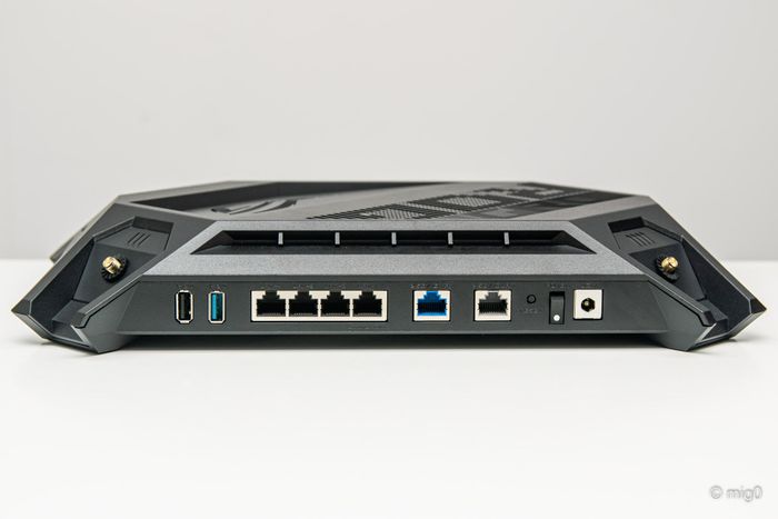 Mặt sau của GT-AX6000 đi kèm 1 cổng USB 2.0, 1 cổng USB 3.2 Gen 1, 4 cổng LAN RJ45 1 Gbps, 1 cổng WAN/LAN RJ45 2.5 Gbps, 1 cổng LAN RJ45 2.5 Gbps, nút Reset, công tắc nguồn và cổng nguồn. Hai cổng 2.5 Gbps hỗ trợ tính năng link aggregation và load balancing, trong khi các cổng 1 Gbps cũng kết hợp để tăng băng thông cho NAS. Cổng LAN 1 Gbps đầu tiên gần cạnh cổng WAN 2.5 Gbps là cổng dành riêng cho gaming, ưu tiên băng thông cho trải nghiệm chơi game mượt mà dù có thiết bị khác đang streaming.