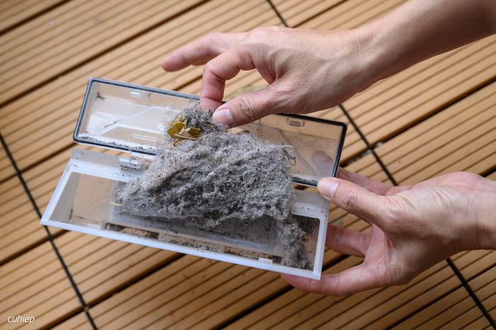 Bụi trong hộp sau vài ngày sử dụng liên tục. Phần lớn là bụi từ thảm, thể hiện rằng G10 hoạt động tốt trên bề mặt này.
