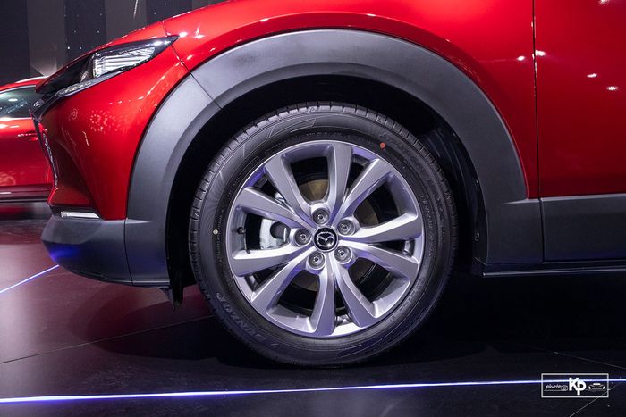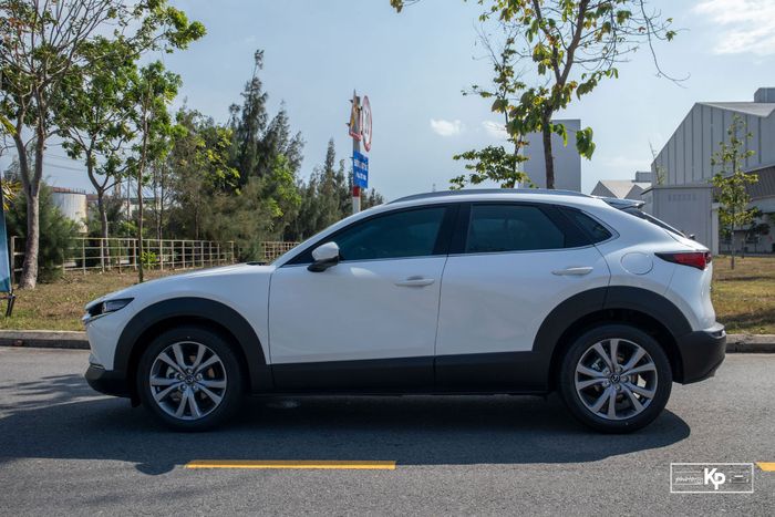 Điểm đặc biệt của CX-30 so với Mazda 3 là bộ la-zăng mạnh mẽ hơn với vòm bánh xe ốp nhựa lớn kích thước 18 inch 5 chấu kéo dạng cánh hoa. Gương chiếu hậu điều chỉnh điện, gập tự động, chống chói và nhớ vị trí. Bản cao cấp có thêm cảnh báo điểm mù cao cấp. Tay nắm cửa tích hợp chìa khóa thông minh trên cả 2 phiên bản.