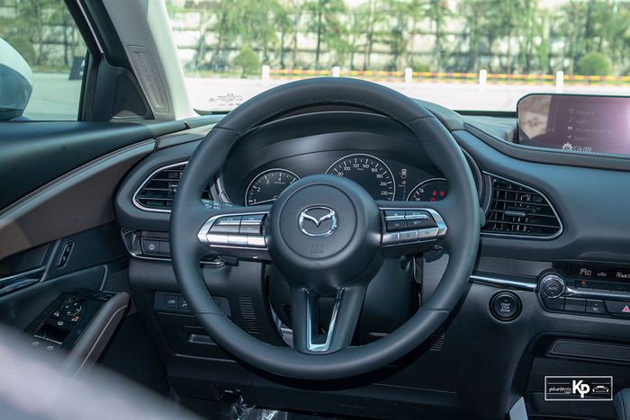 Vô-lăng 3 chấu bọc da của Mazda CX-30 2021 kết hợp với chi tiết crom tạo điểm nhấn. Hệ thống ga tự động, điều chỉnh âm lượng được tích hợp sẵn. Phiên bản cao cấp có thêm nút điều chỉnh ga hành trình thích ứng và cảnh báo lệch làn đường.