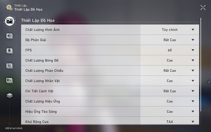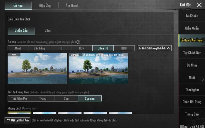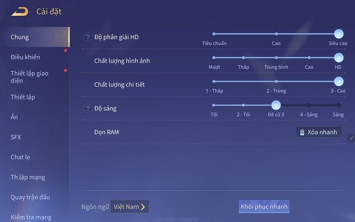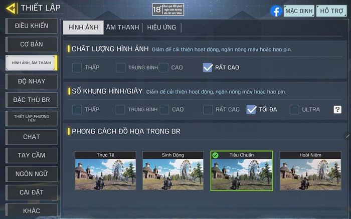 - Thực nghiệm 4 tác vụ liên tục bao gồm: Chơi Liên Quân Mobile (cấu hình đồ họa như hình dưới), xem YouTube, lướt Facebook và duyệt web trên trình duyệt Google Chrome.