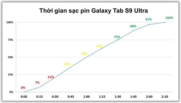 Nhìn vào biểu đồ, để sạc đầy từ 0-100% cho Galaxy Tab S9 Ultra, mất khoảng 2 giờ 10 phút. Lưu ý rằng mình không sử dụng cục sạc chính hãng của Samsung, thay vào đó là củ sạc Ugreen 65W và dây sạc nhanh cũng của Ugreen. Vì vậy, nếu bạn sử dụng cục sạc chính hãng của Samsung, kết quả có thể khác.