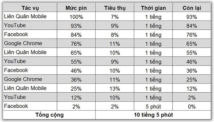 Galaxy Tab S9 Ultra đạt thời gian sử dụng lên đến 10 giờ 15 phút. Đây là một thành tích ấn tượng, cho thấy Snapdragon 8 Gen 2 for Galaxy hiệu quả với cả điện thoại và máy tính bảng. Trong các nhiệm vụ nhẹ như Facebook, duyệt web và xem video YouTube, máy chỉ tiêu thụ khoảng 8% pin cho mỗi giờ sử dụng. Còn với nhiệm vụ nặng hơn như chơi Liên Quân Mobile ở cấu hình cao, con số này nằm trong khoảng 7-13% cho mỗi giờ chơi.