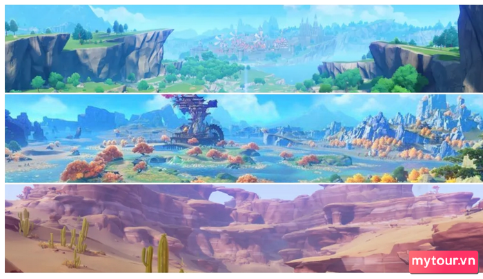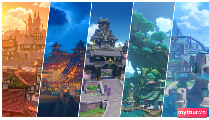 Đặc biệt, thế giới của Genshin Impact không chỉ đa dạng mà còn sôi động. Bản đồ Teyvat có 5 quốc gia độc đáo, mỗi quốc gia được thiết kế dựa trên văn hóa và đặc điểm đặc trưng của các nước như Trung Quốc, Đức, Nhật, Ấn Độ, Pháp, tạo nên một thế giới phong phú và đầy màu sắc.