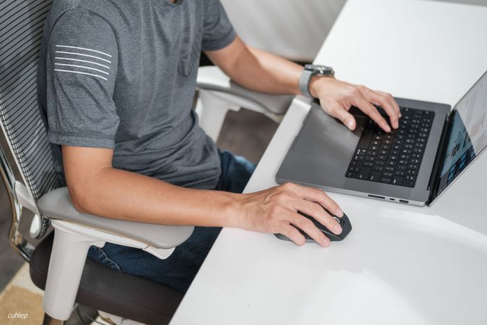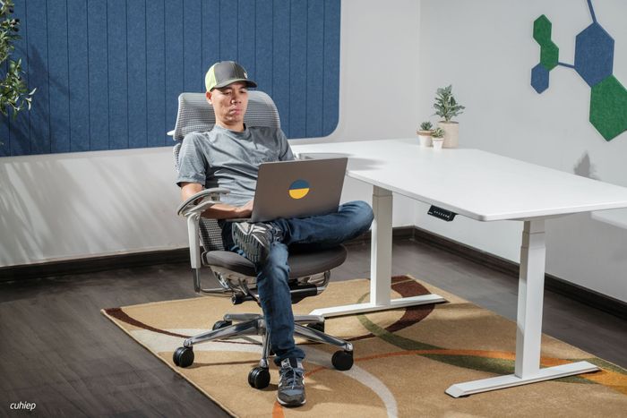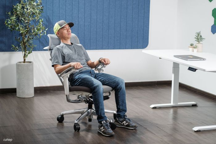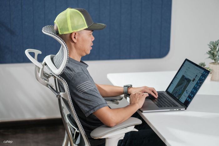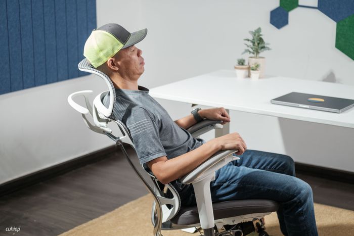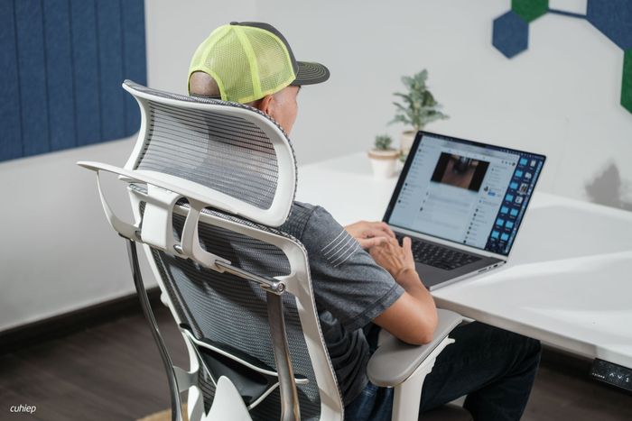 Mình đã thử ngồi hơi ngả ra sau và để máy tính lên đùi khi làm việc. Trải nghiệm này cho thấy tựa lưng rất thoải mái và đầu không cần phải gồng thẳng.