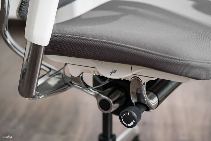 Các nút xoay tròn có thể điều chỉnh độ nặng của tựa lưng. Mình ưa chuộng với cài đặt số 1, vì nó cho phép ngồi thẳng và ngả mà không cần phải thay đổi qua các số khác.
