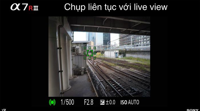 Trên A7RIII, việc chụp liên tiếp 10fps và trên A9 là 20fps với chế độ Xem Trực Tiếp không gây hiện tượng chớp đen. Hệ thống lấy nét hybrid tracking và AI hoạt động hiệu quả tương tự như khi sử dụng ống ngắm EVF. Real-time tracking AF giúp người chụp dễ dàng hơn, đặc biệt là khi quay video, sử dụng chế độ Xem Trực Tiếp, tính năng tracking liên tục giúp việc lấy nét trở nên rất thuận lợi.