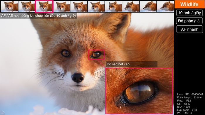 Dưới đây là một đoạn demo chụp liên tiếp 10fps với tính năng AI Real-time tracking AF và Eye AF. Ảnh được phóng to 100% để thấy rõ hơn khi chụp chủ thể chuyển động liên tục, hệ thống lấy nét hoạt động hiệu quả, và người chụp cảm thấy thoải mái và dễ dàng hơn rất nhiều.
