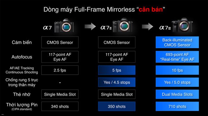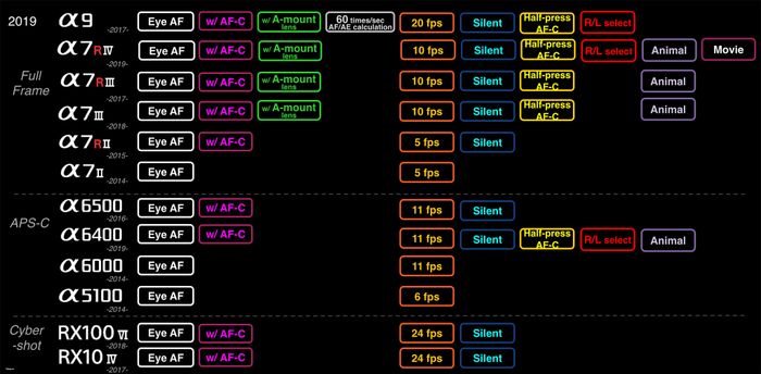 Các dòng máy ảnh Full-Frame Mirrorless cơ bản của Sony như A7 / A7II / A7III đã chứng kiến sự tiến bộ đáng kể trong hệ thống AF/AE tracking chụp liên tiếp từ 2.5 fps lên 5fps và 10fps. Điểm lấy nét đã được cải tiến từ 117 điểm Eye AF lên đến 693 điểm AF Real-time Eye AF (lấy nét mắt người và động vật theo thời gian thực). Sony tích hợp các công nghệ tự phát triển lên các dòng máy của mình, từ dòng compact nhỏ gọn cao cấp RX100 IV cho đến dòng APS-C A6xxx series và dĩ nhiên là dòng máy có cảm biến Full-Frame.