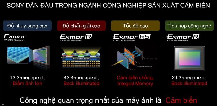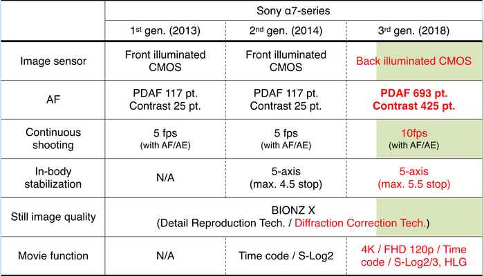 Nói đến công nghệ của Sony khi nói về hệ thống lấy nét trên bề mặt cảm biến. Khi Sony ra mắt chiếc máy mirrorless đầu tiên vào năm 2013, họ đã sử dụng công nghệ cảm biến Front illuminated CMOS và một năm sau đã nâng cấp thế hệ thứ hai (2014) với hệ thống lấy nét PDAF 117 điểm nét, đến 2018 phát triển thành thế hệ thứ 3 là công nghệ cảm biến Back illuminated CMOS với hệ thống lấy nét PDAF 693 điểm nét và 425 điểm tương phản.