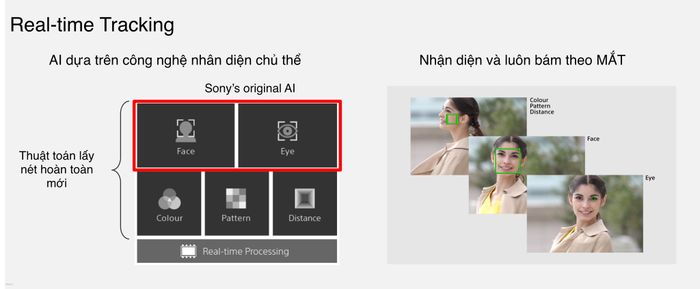 Sony công bố khi ra mắt sản phẩm nói về Real-time Tracking và Real-time Eye AF, cho biết 'đây là tính năng tracking “lai” (hybrid tracking) mới bằng cách sử dụng kết hợp giữa khoảng cách, chuyển động, nhận diện khuôn mặt, Eye AF, màu sắc và bố cục. Việc kết hợp tất cả thứ này với thuật toán AI, máy ảnh có thể phân định được loại cơ thể người, kiểu quần áo, tóc, cách di chuyển, sử dụng Eye AF và nhận diện khuôn mặt cùng một lúc. Nhờ đó, việc AF sẽ trở nên dễ dàng và mạnh mẽ hơn bao giờ hết.'