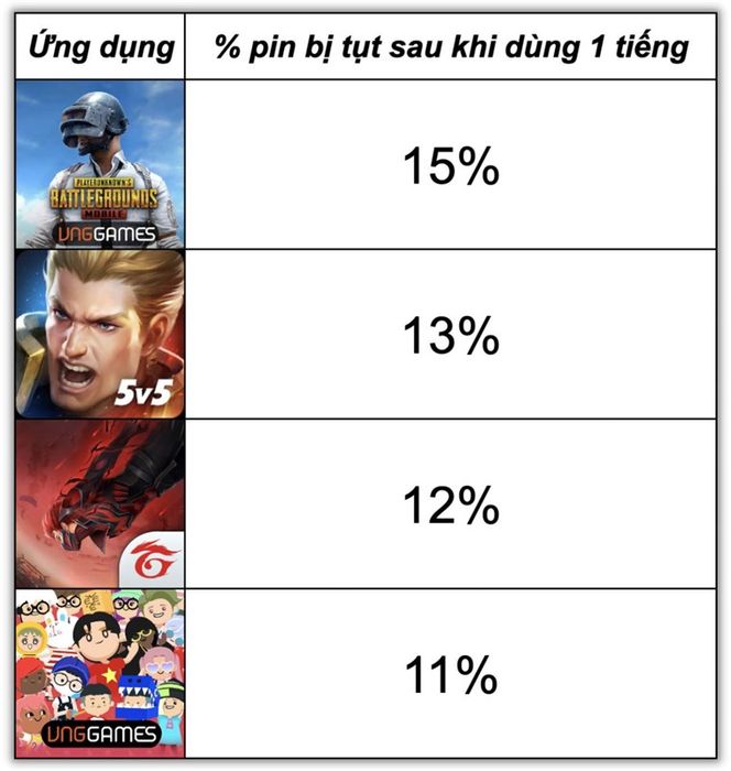 - PUBG Mobile: Sau 1 giờ chơi, pin giảm 15%.