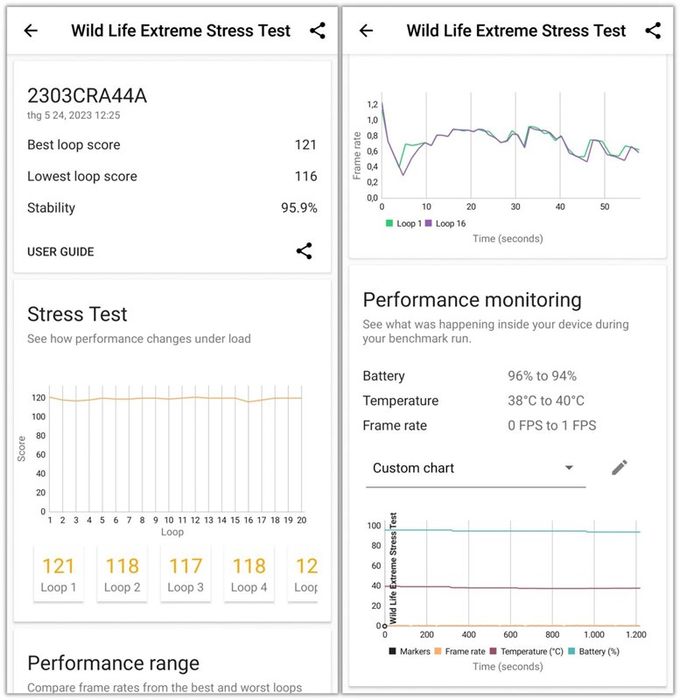 Theo bảng kết quả trên, Redmi Note 12S thể hiện sự ổn định với Stability (độ ổn định) đạt 95.9%. Điểm tốt nhất trong vòng lặp (Best loop score) (121 điểm) và điểm thấp nhất (Lowest loop score) (116 điểm) chỉ chênh lệch 5 điểm, chứng tỏ Redmi Note 12S có khả năng xử lý tác vụ nặng một cách ổn định.