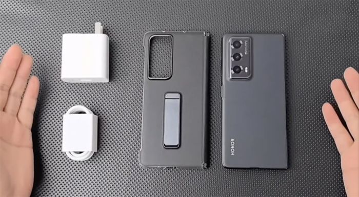 Khám phá bên trong, bản hộp Honor Magic Vs2 không chỉ có chiếc điện thoại mà còn đi kèm đầy đủ những phụ kiện quan trọng như ốp lưng trong suốt, sách hướng dẫn, que chọc SIM, và bộ sạc nhanh. Điều này giúp người dùng tiết kiệm thời gian tìm kiếm phụ kiện từ bên thứ ba.