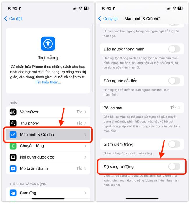 Tại phần cài đặt Trợ năng của iPhone 11, mình đã chọn mục Màn hình & Cỡ chữ để vô hiệu hóa tính năng Độ sáng tự động (áp dụng cho cả iOS 18 và iOS 17).