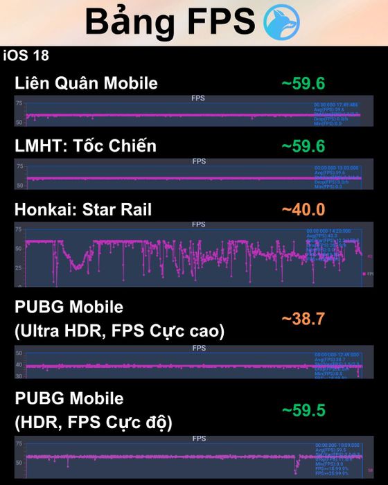 Dưới đây là bảng kết quả đo FPS của 4 trò chơi mà mình đã thử nghiệm trên iPhone 11 ở iOS 18 và iOS 17.