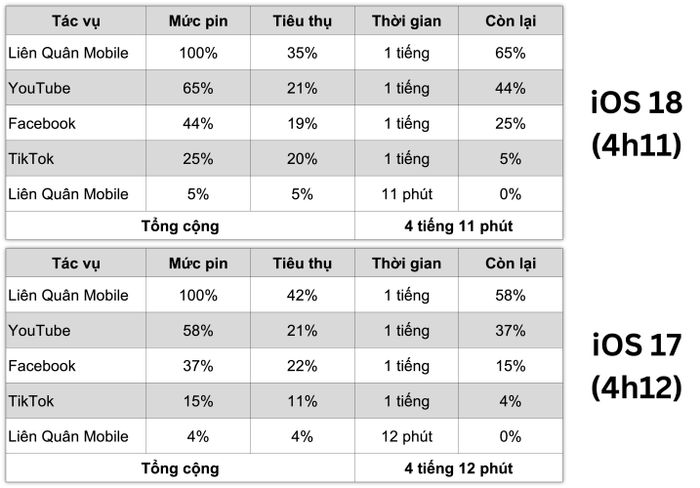 Hình ảnh so sánh dưới đây cho thấy rằng pin của iPhone 11 (với tình trạng pin 96%) có thể hoạt động liên tục trong 4 giờ 11 phút trên iOS 18 và 4 giờ 12 phút trên iOS 17.