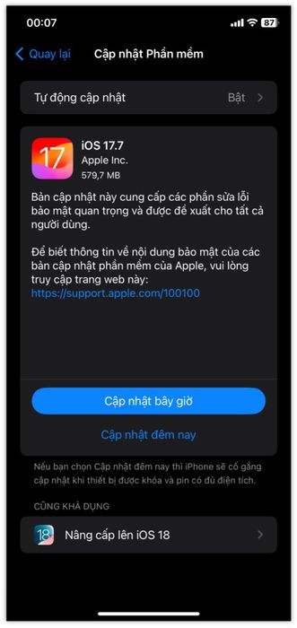 Trước khi mình quyết định nâng cấp lên iOS 18, hệ thống đã gợi ý cho mình xem xét lựa chọn phiên bản iOS 17.7 (khoảng ~579 MB) để khắc phục lỗi bảo mật cho thiết bị.