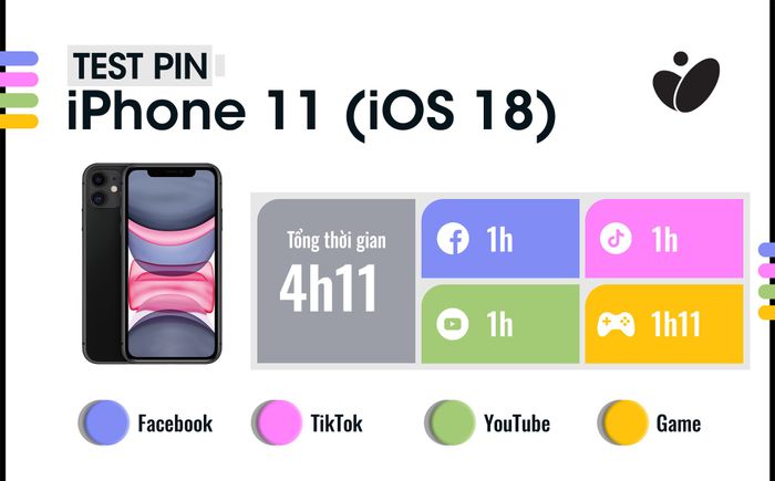 Với 100% pin trên iPhone 11 và các tiêu chuẩn trong bài đánh giá pin, dưới đây là thời gian sử dụng cho từng tác vụ trên iOS 18 và iOS 17.