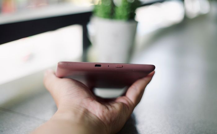 Về phần thiết kế, khi cầm Kindle Paperwhite 4, bạn sẽ cảm thấy khá dễ chịu với mặt lưng ôm sát màn hình phía trên. Mình đang sử dụng phiên bản màu Plum, mặc dù hơi nổi bật vì không còn màu xanh hoặc màu đen, nhưng nhìn chung vẫn khá ấn tượng. Chất liệu mặt lưng làm từ nhựa và phủ một lớp cao su mỏng, tuy nhiên, điều này làm mình không rất thích vì khi tay ra mồ hôi, việc cầm nó có thể gây ra tiếng kêu rít rít. Bên cạnh đó, Kindle Paperwhite 4 rất nhẹ và mỏng, giúp bạn dễ dàng mang theo trong các túi nhỏ.