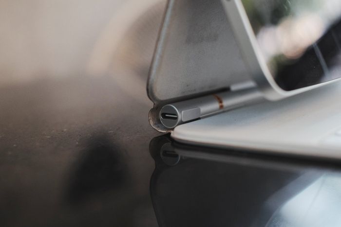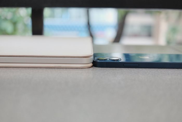 Có một điểm mà nếu bạn thường xuyên mang laptop đi ra ngoài, bạn sẽ chú ý đến đó là khi đặt laptop xuống một mặt phẳng hơi nghiêng hoặc đặt lên đùi, bạn sẽ cảm thấy hơi không thoải mái. Thường thì các laptop không có mặt đáy hoàn toàn phẳng như Magic Keyboard, đặc biệt là MacBook với 4 nút cao su dưới đáy. Điều này khiến iPad của mình có thể sử dụng mọi lúc mọi nơi mà không gặp cảm giác không thoải mái. Nhờ mặt đáy phẳng và phần trên nặng, bạn có thể dễ dàng sử dụng combo iPad Pro 12.9 + Magic Keyboard kiểu bên dưới, đặc biệt hữu ích khi bạn phải làm việc tại những quán có bàn nhỏ.