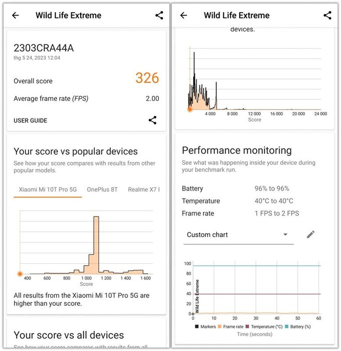 Bài test Wild Life Extreme: Điểm tổng 326, tốc độ khung hình trung bình 2.0 FPS. Dù chỉ ở mức trung bình, nhưng khả năng kiểm soát nhiệt độ và điện năng của Redmi Note 12S rất ổn định (pin 96%, 40 độ C).