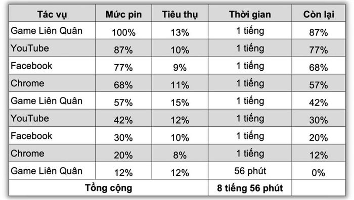 - Mỗi tác vụ sử dụng 1 giờ, độ sáng màn hình 100%, tốc độ làm tươi 90 Hz, loa ngoài âm lượng 50%, WiFi và thông báo xã hội đều được bật.