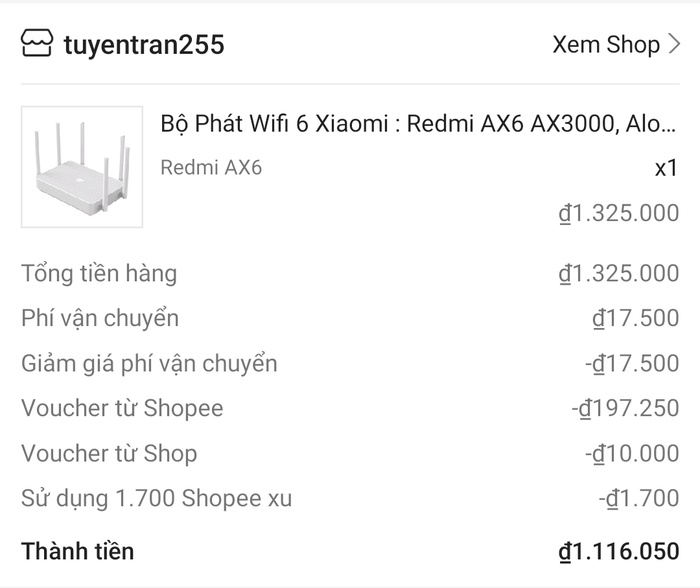 Mình đã suy nghĩ về việc sử dụng Mesh, nhưng không thích việc không tự động kết nối vào 2.4GHz hoặc 5GHz. Mesh thường tổng hợp cả hai dải tần này và không phải loại nào cũng thông minh trong việc tối ưu sóng 5GHz cho thiết bị gần. Không biết các loại cao cấp tầm 8-10tr có gì khác biệt không, vì chưa trải nghiệm. Sau nhiều suy nghĩ, tôi quyết định mua Router Wifi Redmi AX6 với giá giảm gần 200K, chỉ còn 1tr120.