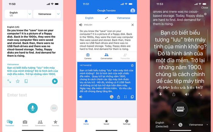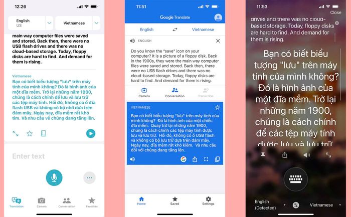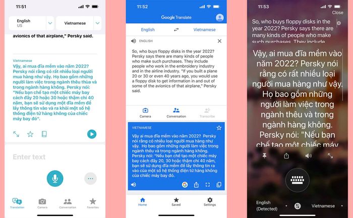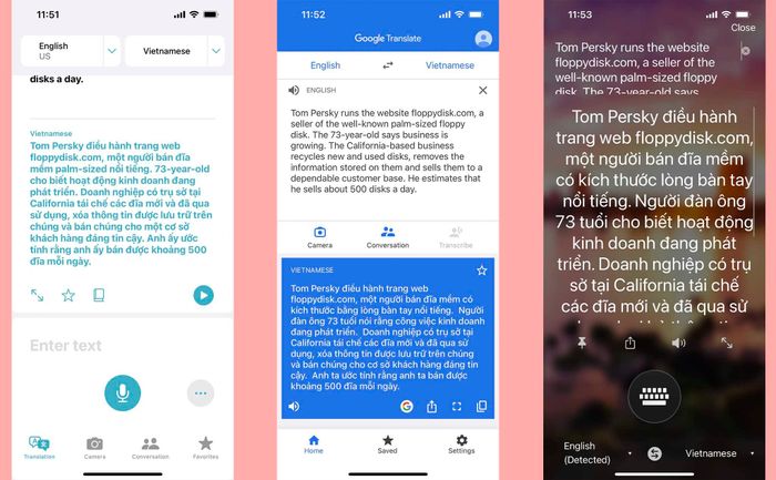 Theo thứ tự từ trái sang phải: Dịch của Apple, Dịch của Google và Dịch của Microsoft.Dịch của Apple: Trong các đoạn văn có từ vựng rõ nghĩa và cấu trúc ngữ pháp rõ ràng, Dịch của Apple phản ứng khá tốt. Tuy nhiên, nếu có những cụm từ mang tính chất “thay thế” hoặc ẩn dụ, Dịch của Apple không thể dịch hoặc dịch không tốt. Do đó, nó không truyền đạt được hoàn toàn nội dung cần truyền đạt. Đoạn văn này là một đoạn văn khá đơn giản về từ vựng và ngữ pháp. Tôi nghĩ Dịch của Apple dịch khá tốt, chỉ có vài chỗ chưa hay hoặc hơi dài dòng. Ví dụ, “back in the 1900s” có thể dịch thành “vào những năm 1900”, hoặc “cloud-based storage” có thể dịch là “lưu trữ dựa trên đám mây” là được.Dịch Google cho phép bạn chuyển đổi văn bản một cách hiệu quả hơn so với Apple Translate, tuy nhiên vẫn còn hơi cơ hồ và thiếu đi sự 'con người'. Ví dụ, 'demand for them' được dịch là 'nhu cầu về chúng' (như cách Apple Translate dịch).Dịch vụ Microsoft TranslatorBạn có biết biểu tượng 'lưu' trên máy tính của bạn đang ám chỉ gì không? Đó chính là hình ảnh của một chiếc đĩa mềm. Vào thập niên 1900, đĩa mềm là phương tiện phổ biến nhất để lưu trữ dữ liệu máy tính. Lúc đó, không có USB hoặc lưu trữ đám mây như hiện nay. Hiện nay, việc tìm kiếm đĩa mềm trở nên vô cùng khó khăn, nhưng nhu cầu về chúng lại đang tăng lên.Tom Persky điều hành trang web floppydisk.com, một người bán đĩa mềm kích thước lòng bàn tay nổi tiếng. Ông 73 tuổi nói rằng kinh doanh đang phát triển. Công ty có trụ sở tại California tái chế các đĩa mềm mới và đã qua sử dụng, loại bỏ thông tin được lưu trữ trên chúng và bán cho một khách hàng đáng tin cậy. Ông ước tính rằng mỗi ngày ông bán khoảng 500 đĩa mềm.Đoạn văn này có một chút khó khăn hơn và gây nhầm lẫn cho Apple Translate ngay từ đầu. Nó không thể dịch toàn bộ đoạn văn và không thể hiểu được cả thông điệp và phong cách của tác giả. Về từ vựng, “palm-sized floppy disk” có thể dịch là “đĩa mềm kích thước lòng bàn tay”, “73 tuổi” nên dịch là “người 73 tuổi”, “công ty có trụ sở tại California” có thể dịch là “doanh nghiệp có trụ sở tại California” (Apple Translate không nhận diện được ý nghĩa của mạo từ “the”), và còn nhiều điều nữa. Hoặc như ở câu cuối cùng, “He” có thể dịch là “Ông ấy”, không phải “Anh ấy” (đã 73 tuổi rồi mà).