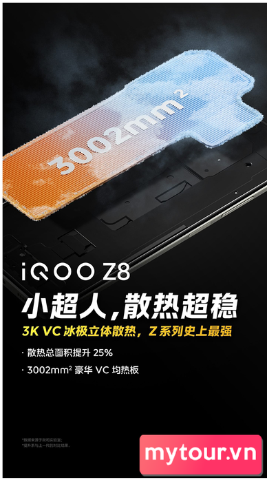 vivo khẳng định iQOO Z8 hỗ trợ 120FPS trong King và duy trì FPS trung bình 119FPS trong thử nghiệm chơi game 1 giờ. Hệ thống làm mát diện tích 3002mm2, tăng 25% so với thế hệ trước, giúp hiệu suất ổn định.
