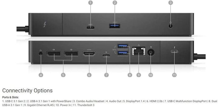 WD19TB là Thunderbolt Dock cho phép chuyển đổi từ một cáp Thunderbolt 3 Type C duy nhất (cáp dài 80cm) thành 11 cổng kết nối.