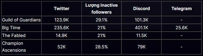 Bảng 3: Bảng so sánh số liệu thống kê xã hội của GOG với các game NFT cùng thể loại khác (Twitter, SparkToro, Discord, Telegram)