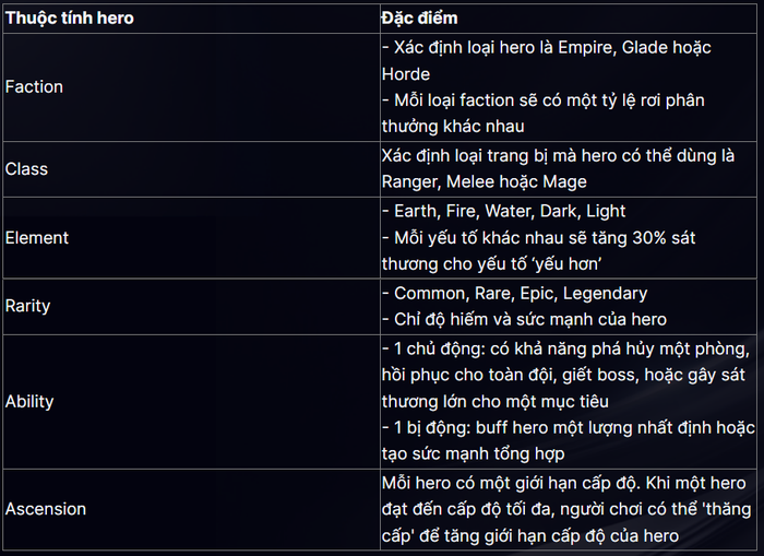 Bảng 1: Đặc điểm các thuộc tính của anh hùng