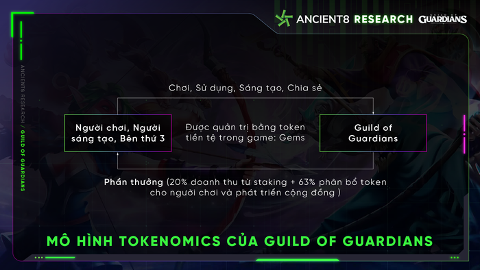 Hình 5: Mô hình kinh tế của GOGMột trong những điểm đặc biệt của nền kinh tế Guild of Guardians là ‘pool phần thưởng’. Gems được sử dụng trong trò chơi sẽ được gửi vào ‘pool phần thưởng’ này. Ngoài ra, 20% doanh thu từ bán hàng chính và phụ sẽ được chuyển đổi thành Gems và đưa vào ‘pool phần thưởng’, sau đó phân phối cho những người nắm giữ Gems tích cực tham gia staking. 63% token dùng để phát triển cộng đồng và là phần thưởng cho play-to-earn cũng sẽ được sử dụng để thưởng cho người chơi. Gems còn được sử dụng để quản lý và bỏ phiếu.